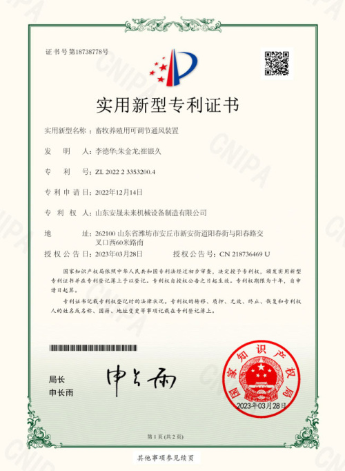 畜牧養(yǎng)殖用可調(diào)節(jié)通風(fēng)裝置證書